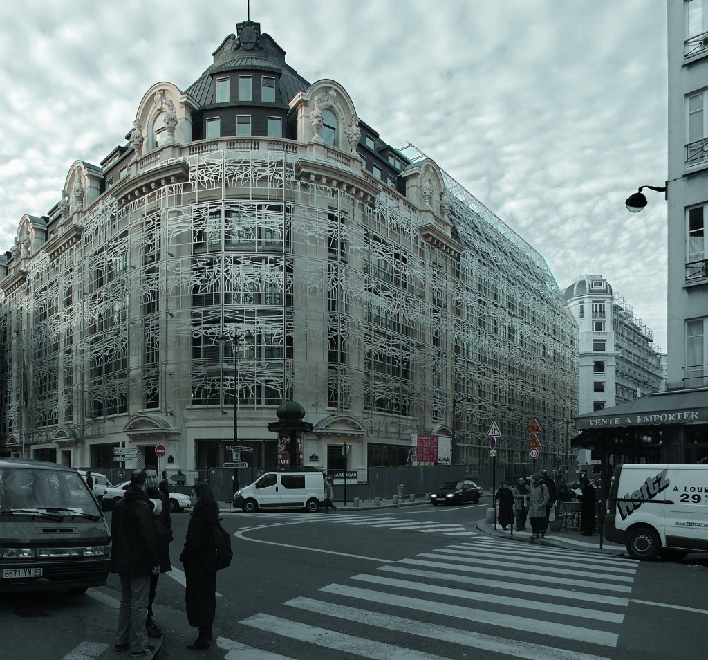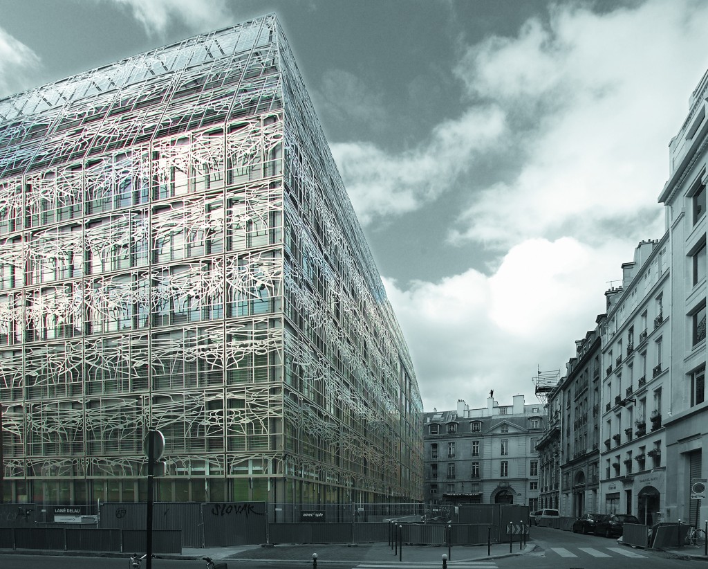 Doch ist es diese metallische Haut, welche zusammen mit dem wechselnden Tageslicht den Reiz des Projektes ausmacht. Mit einen sich wiederholenden Muster legt sie sich gleichmäßig über die Baukörper. Jegliches Licht, welches in die Gebäude dringt, wird durch die abstrakten Formen gefiltert, gezeichnet und geprägt. Die metallische Haut ist starr und wird doch durch das Licht bewegt. Teilweise dringt es in die Innenräume ein, teilweise lässt es sich wieder in den Straßenraum reflektieren und leitet den grauen Pariser Stadthimmel hinunter auf die Gehwege.