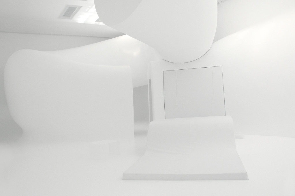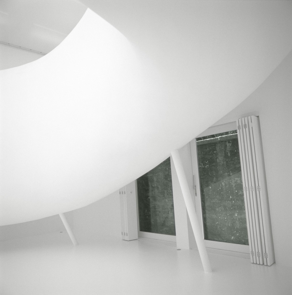 Inspiriert von den Bars und Spielcasinos der 30er Jahre in Chicago, tarnt er die Ausstellungen und führt den Zugang der Galerie zuerst durch das Lager der Kunstsammlung und kontrastiert den im Rohzustand gelassene und mit Kisten gefüllten Lagerraum mit dem Galerie- und Wohnbereich. Betritt man diesen hintern Bereich, ist man erstmal überrascht. Wie ein Tier unter die Haut, schiebt sich die skulpturale Form des Wohnbereiches unter die Farbschicht. Langsam beult sie diese entlang der Wand weiter aus, löst sich ab und erstreckt sich mit einer schlängelnden Bewegung frei in den Raum. Komplett in weiß gehalten verwirrt der diffus von oben beleuchtete Raum die Sinne. Formen und Distanzen verwischen sich und sind kaum abzuschätzen. In dem leeren, gerade fertig gestellten Raum sucht man verzweifelt einen „störenden“, farbigen Punkt um sich visuell festzuhalten.
