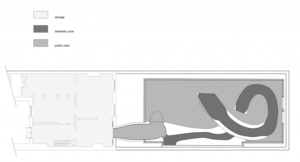 In den Projekten von R&Sie… findet man öfters die Konfrontation zwischen einem orthogonalen System und einer freien Form, wie bei dem letztens fertig gestellten Maison Barak. Denn es ist nicht die Form selbst, die das Büro interessiert, sondern die Überlagerung von zwei Systemen und die entstehenden Zwischenräume. Bei dem Projekt der Kunstgalerie trennen die gekrümmten Wände den Wohnbereich nicht vollständig von Ausstellungsbereich ab. Der Wohnbereich ist immer noch Teil der Galerie und bewegt sich in ihr. Er bleibt Teil des kontinuierlichen Raumes. Die skulpturale Form, welche Küche, Sanitär und Schlafbereiche aufnimmt, ermöglicht es die Kontakt- und Reibungsfläche zwischen dem Ausstellungs- und Wohnbereich zu vergrößern und beide Zonen ohne direkte Sichtverbindungen zu verknüpften. Vom Inneren des Wohnbereiches spürt und hört man die Präsenz der Galerie ohne die Intimität des Privatbereiches zu verlieren.