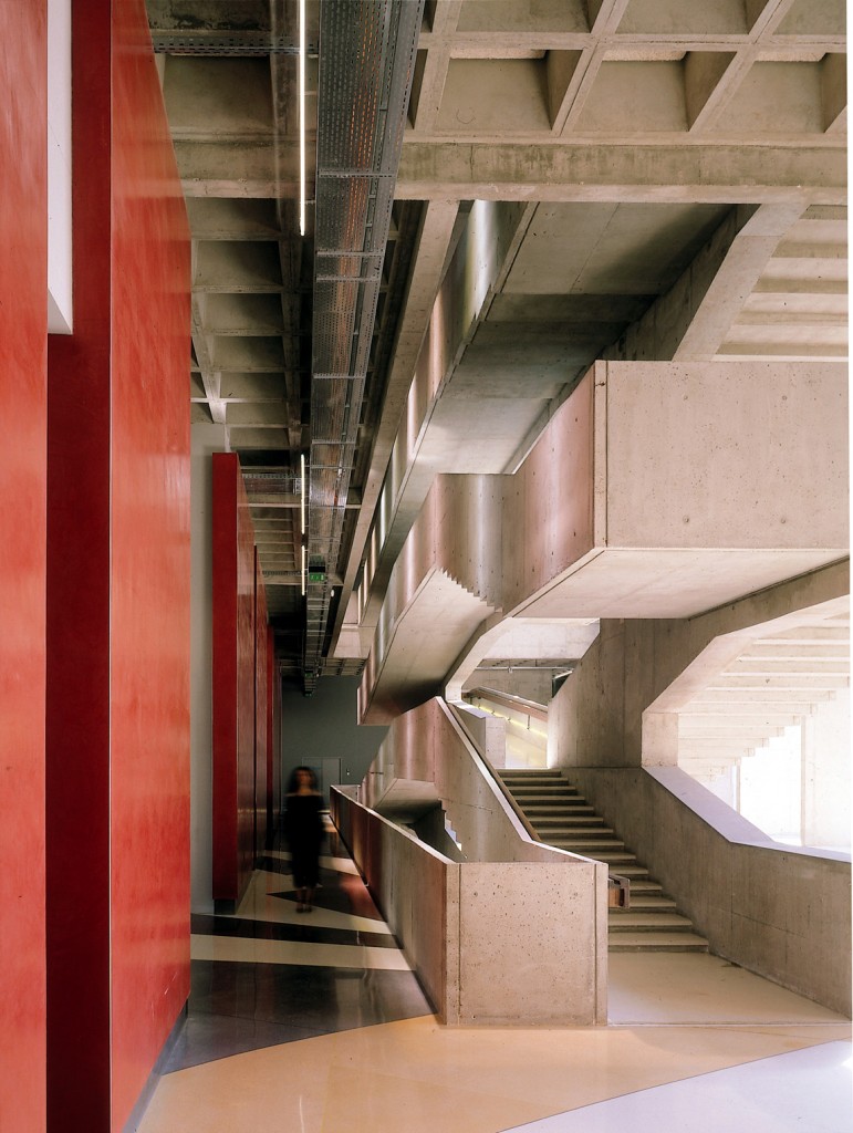 They centralized the program around the large, 85-foot- (26-meter-) long entry hall, which stretches up to the sixth floor. This impressive space is dominated by a massive concrete stair and ramp leading gradually to top.