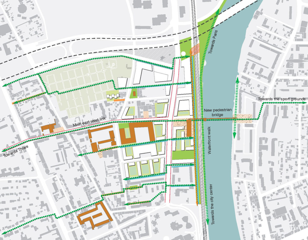 A particular aspect in the Plaine Saint-Denis regeneration process is the well organised beginning. Instead of transforming the site plot by plot, Plaine Renaissance first set up an inter-municipal development agreement and then initiated a planning and design competition for the whole area on this base. Secondly, instead of designating one single winner of this competition, they asked the competitors to team up and create one single design association, called Hippodamos 93. This association advised the local authorities during the following ten years on the regeneration process.